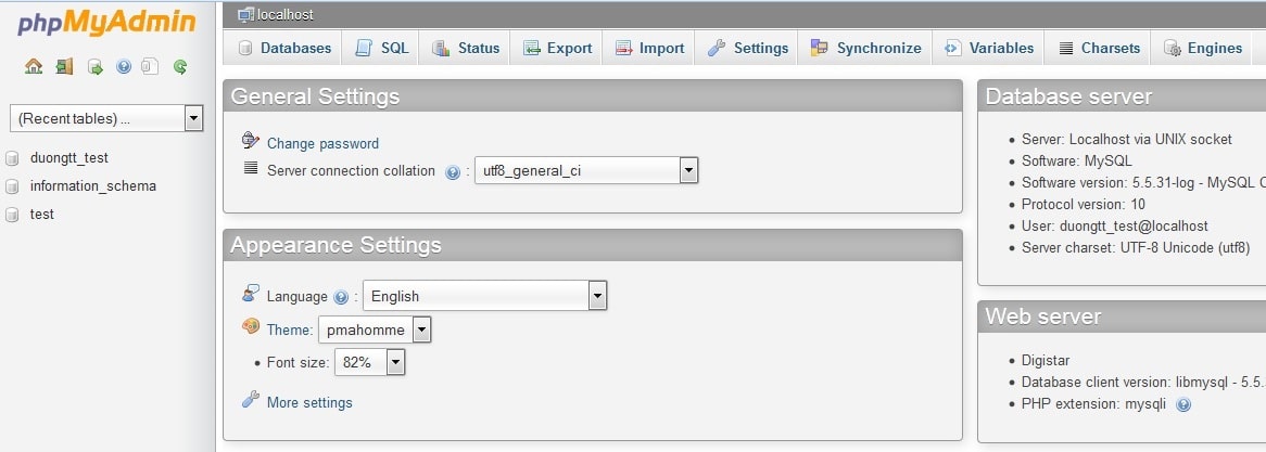 Sau khi đăng nhập vào được phpMyAdmin ta có thể thao tác trên database ta đã tạo lúc đầu.