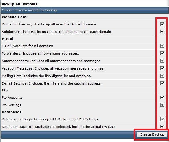 Chọn những dữ liệu cần backup -> “Create Backup“