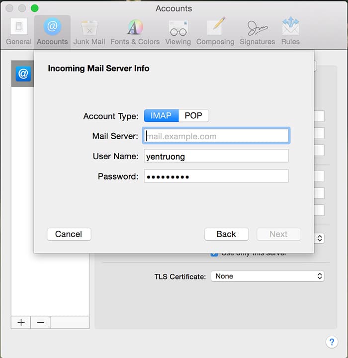 Lựa chọn IMAP hoặc POP cho email, điển thông tin tài khoản server (incoming Account) của bạn vào đây.