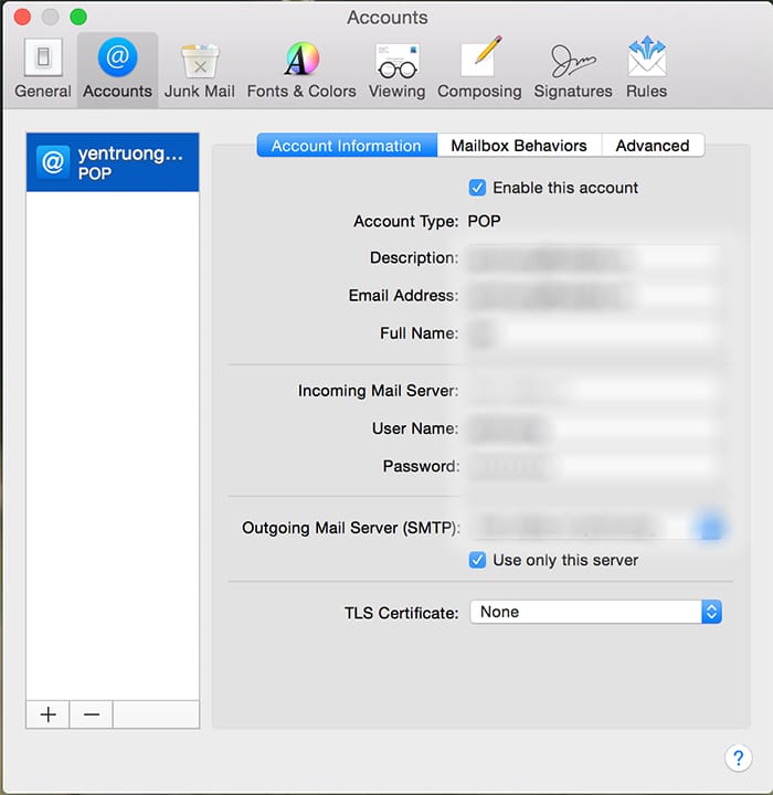 Để thêm một tài khoản mail vào thì chúng ta chọn tab accounts, khung bên trái phía dưới có đấu “+” và “-” để thêm và xóa tài khoản khỏi ứng dụng mail.