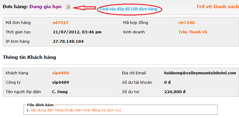 Sau khi Hosting đã hoạt động, quay lại đơn hàng để cập nhật chi tiết đơn hàng: