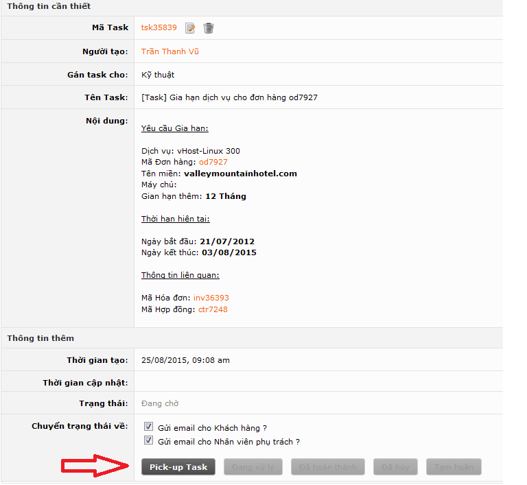 Gia hạn 1 đơn hàng hosting, ta click vào Pick-up Task để nhận đơn hàng về user của mình:
