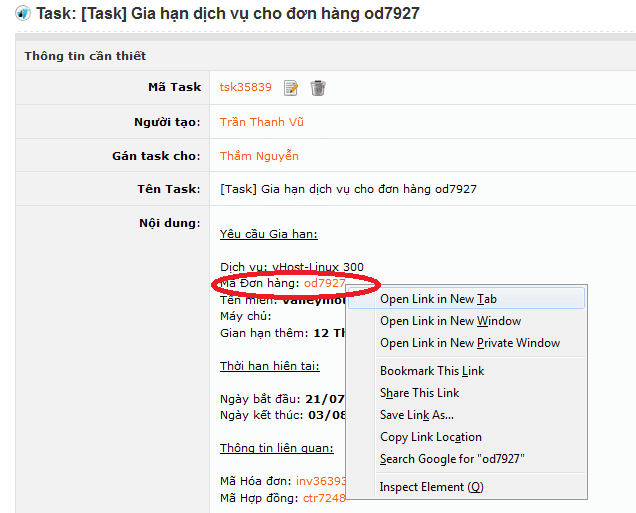 Trường hợp hosting đã hết hạn và bị suspend. Các thông số server sẽ bị mất. Do đó ta phải edit lại đơn hàng theo các bươc sau, click chuột phải chọn Mã đơn hàng: