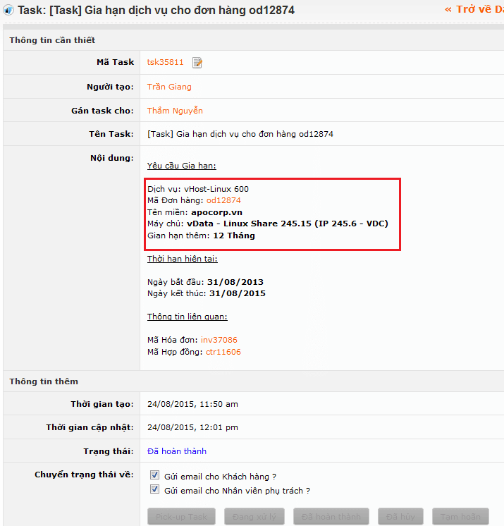 Trường hợp đơn hàng gia hạn khi chưa hết hạn sử dụng, ta chỉ cần click vào button Đã Hoàn thành để hoàn tất việc gia hạn mà không cần làm gì thêm.