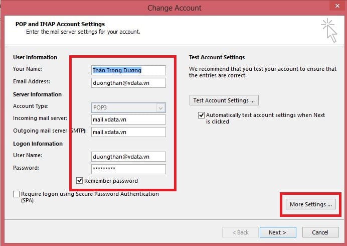 Nhập các thông tin của email cần cấu hình -> “More Setting“