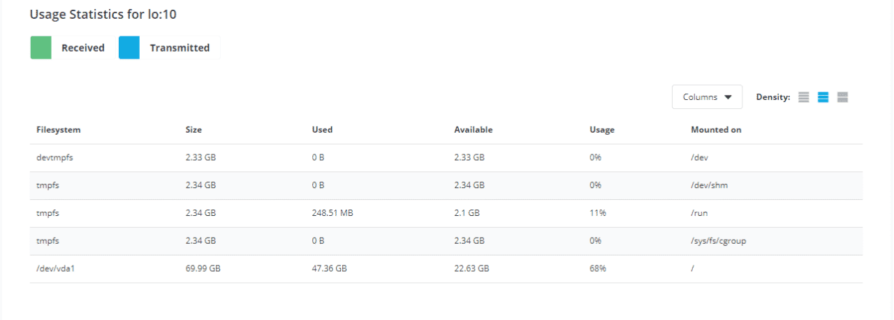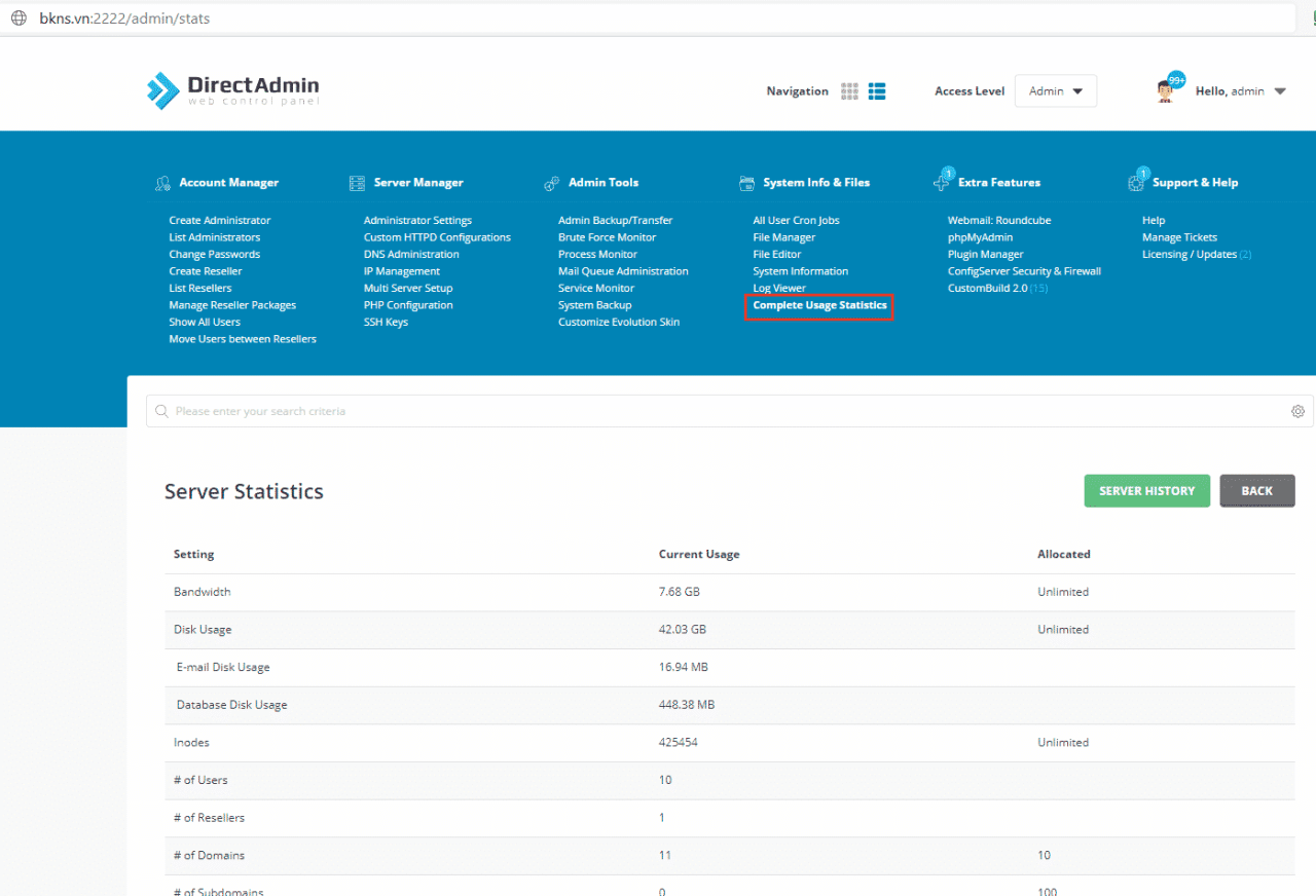 Tại phần System Info & File chọn Complete Usage Statistics để kiểm tra dung lượng Disk đang sử dụng trên VPS
