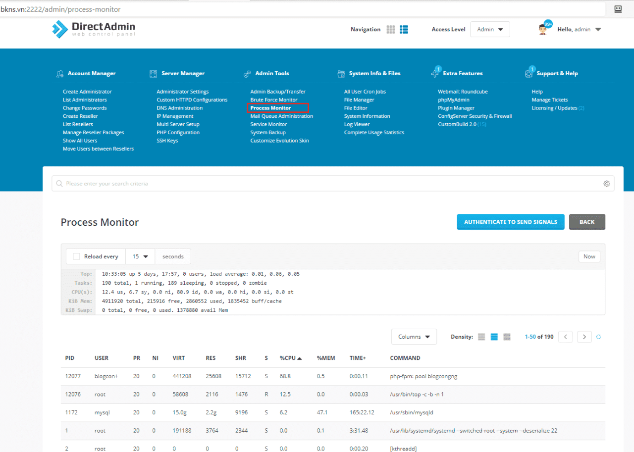 Tại Admin Tools truy cập Process Monitor để kiểm tra tài nguyên CPU và Ram đang được sử dụng