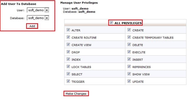 – Tại Tab Databases >> chọn Chọn MySQL Databases >> chọn Add User To Database >> Chọn User và Database cần ADD chọn Bấm chọn Add >> Check vào ALL PRIVILEGES >> chọn Bấm Make Changes .