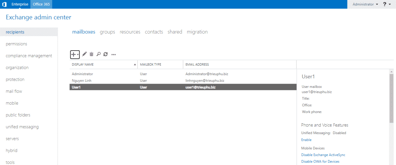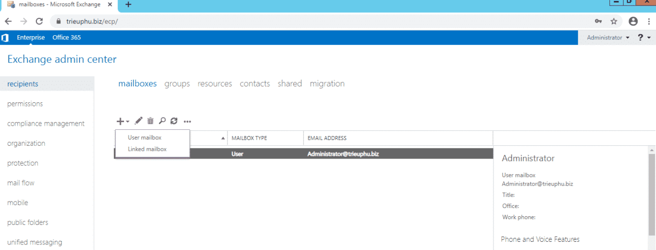 Trên giao diện quản lý Mail Exchange 2016 tạo mailbox. Chọn vào recipients và Click vào dấu cộng rồi chọn phần User mailbox