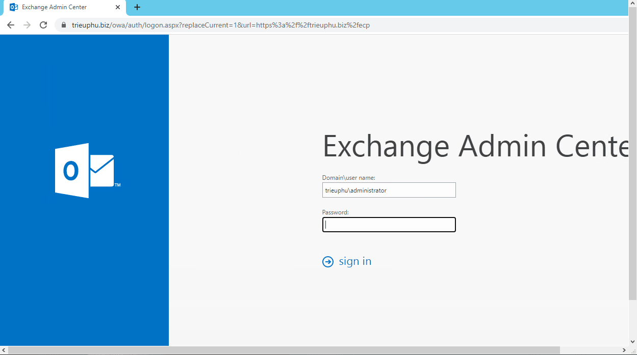 Đăng nhập vào user administrator của Domain để quản lý và cấu hình Mail Exchange Server 2016