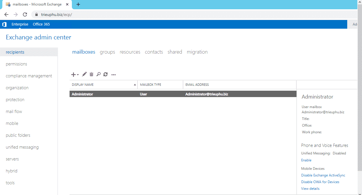 1. Mở giao diện quản lý Mail Exchange Administrative Center để tạo mailbox và cấu hình