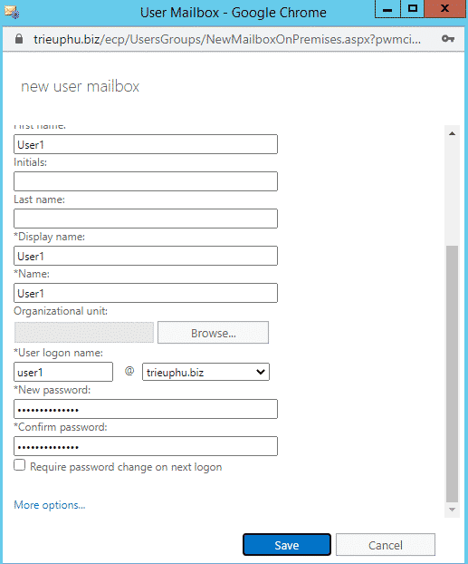 Hộp thoại new user mailbox xuất hiện ta tạo user mới