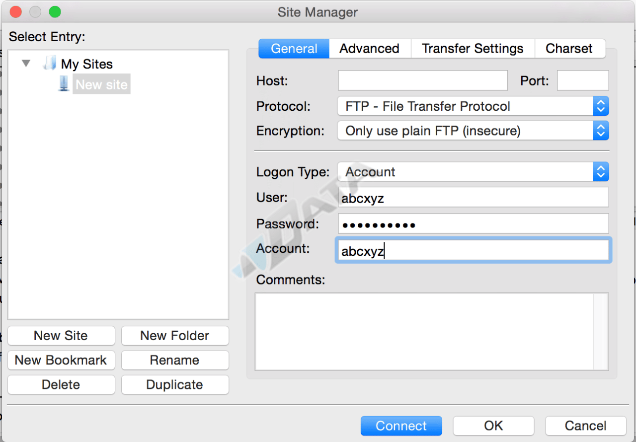 – Logon tybe: Các bạn có thể chọn cách khác nhưng mình thường chọn Account, sau đó điền các thông số của Account FTP vào.