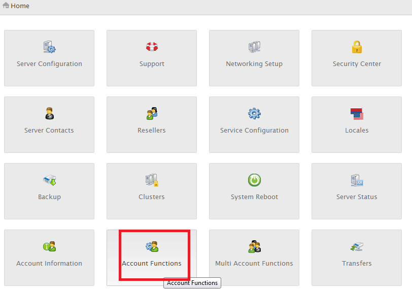 Login vào WHM cPanel -> Home -> Acount Functions :