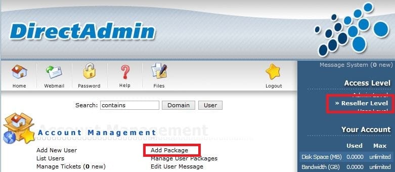 Sau khi đăng nhập admin vào DirectAdmin ta chọn “Reseller Level” -> Chọn “Add Packages”