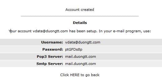 Xem lại thông tin email account đã tạo.