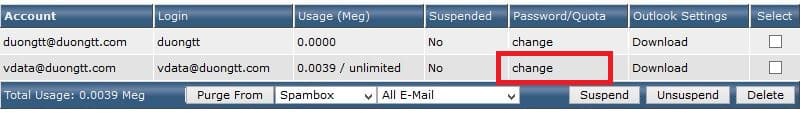 Để thay đổi password cho email account ta chọn “Change“